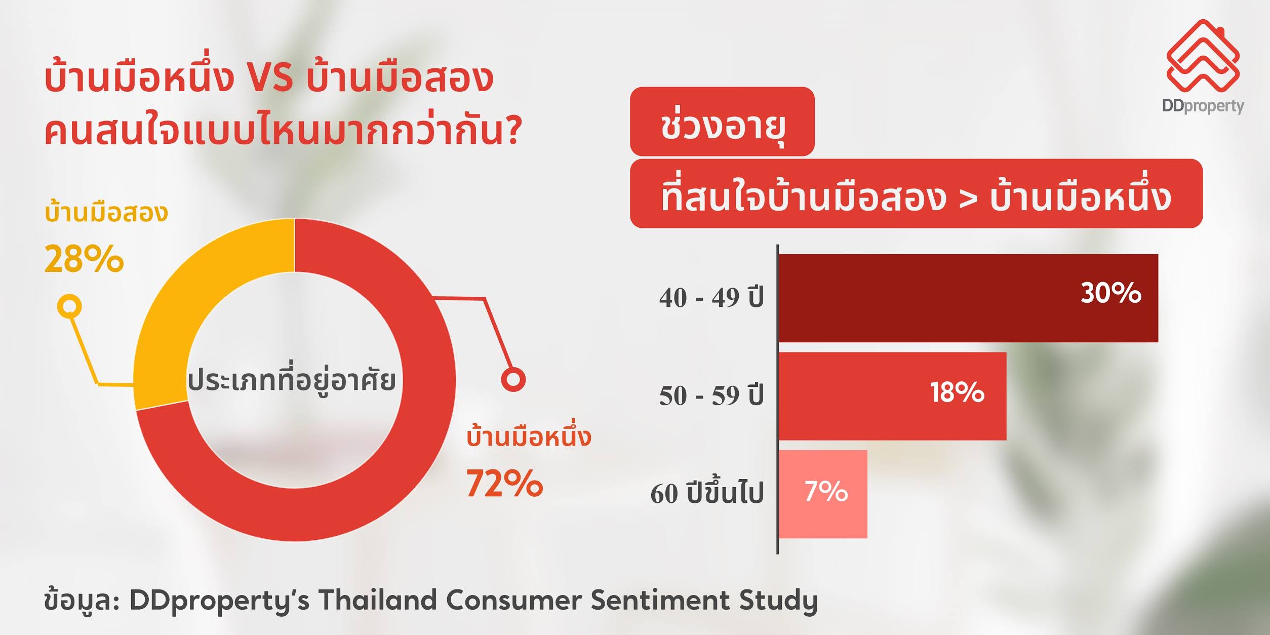 • หาบ้านในราคาที่เอื้อมถึงได้ง่าย ราคาถือเป็นปัจจัยสำคัญของการซื้อที่อยู่อาศัยไม่น้อย บ้าน/คอนโดมิเนียมมือสองผ่านการใช้งานมาแล้วแม้จะอยู่ในสภาพที่สมบูรณ์และยังสวยอยู่ แต่เมื่อคิดค่าเสื่อมราคาแล้วทำให้มีราคาต่ำกว่าบ้านมือหนึ่งเมื่อเทียบปัจจัยที่เหมือนกัน ซึ่งช่วยประหยัดค่าใช้จ่ายได้มากขึ้นเหมาะกับผู้ที่อยากมีบ้านแต่มีกำลังซื้อจำกัดในตอนนี้ ข้อมูลจากผลสำรวจฯ DDproperty’s Thailand Consumer Sentiment Study ยังเผยว่า เหตุผลแรกที่ทำให้ 63% ของผู้บริโภคที่มีรายได้น้อยตัดสินใจเลือกซื้อที่อยู่อาศัยมือสองเนื่องจากมีราคาถูกกว่าโครงการที่เปิดใหม่ ในขณะที่ผู้บริโภคที่มีรายได้ปานกลางและรายได้สูง (51% และ 77% ตามลำดับ) สนใจซื้อบ้านมือสองเพราะอยากได้ที่อยู่อาศัยที่สวยงามตรงตามสภาพจริง ไม่ต้องรอลุ้นหลังโครงการก่อสร้างแล้วเสร็จ นอกจากนี้ หากผู้ซื้อต้องการรีโนเวทหรือตกแต่งเพิ่มเติมตามสไตล์ที่ชื่นชอบก็สามารถกันงบประมาณส่วนต่างของการซื้อบ้านใหม่มาใช้ได้ทันที เพราะถึงอย่างไรการซื้อบ้านมือหนึ่งก็ต้องมีการตกแต่งเพิ่มให้สวยงามตามใจผู้ซื้ออยู่แล้ว เมื่อนำค่าใช้จ่ายที่ใช้ซื้อบ้านมือสองมารวมกับค่ารีโนเวท/ตกแต่งก็ถือว่าคุ้มค่าและมีราคาไม่สูงเท่าการซื้อบ้านมือหนึ่งแน่นอน
