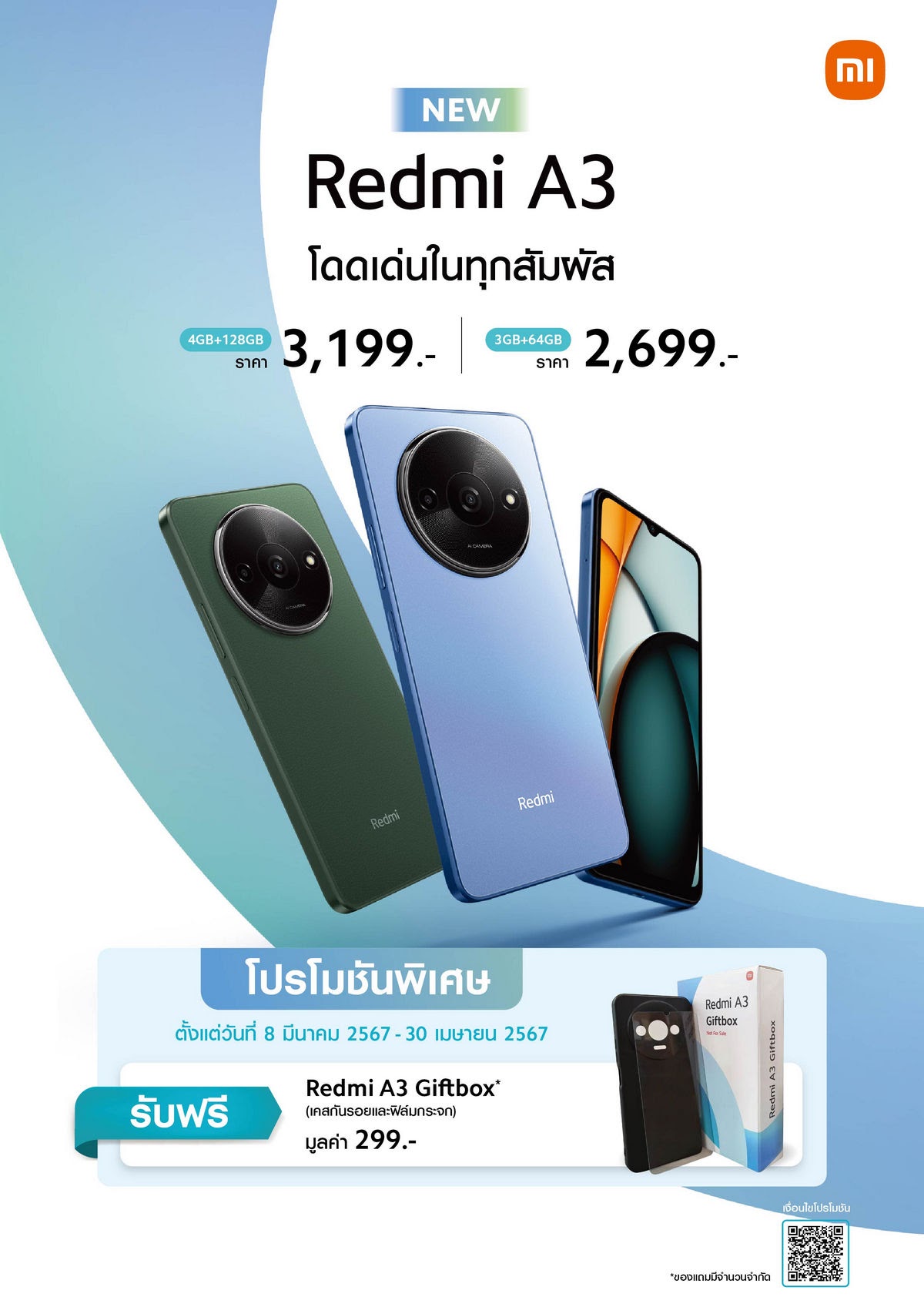 เสียวหมี่ ประเทศไทย วางจำหน่าย Redmi A3 สมาร์ทโฟนรุ่นใหม่จากกลุ่มสมาร์ทโฟน Redmi รุ่นเริ่มต้น โดยตัวอุปกรณ์มาพร้อมสไตล์อันโดดเด่น หน้าจอขนาดใหญ่อัตรารีเฟรชสูง กล้อง AI คู่และฟีเจอร์อื่นๆ อีกมากมาย โดยวางจำหน่ายอย่างเป็นทางการในประเทศไทย 2 รุ่นความจุ ได้แก่ รุ่นความจุ 3GB+64GB ในราคา 2,699 บาท และรุ่นความจุ 4GB+128GB ในราคา 3,199 บาท พิเศษ! สำหรับลูกค้าที่ซื้อสินค้าในระหว่างวันที่ 8 มีนาคม 2567 - 30 เมษายน 2567 รับฟรี Redmi A3 Giftbox มูลค่า 299 บาท1 ที่ Xiaomi Store และร้านตัวแทนจำหน่ายที่ร่วมรายการทั่วประเทศ รวมถึงช่องทางการจัดจำหน่ายทางออนไลน์แพลตฟอร์ม