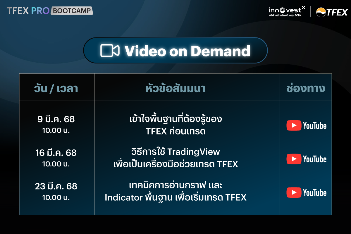 บริษัทหลักทรัพย์ อินโนเวสท์ เอกซ์ จำกัด เรือธงด้านการลงทุนภายใต้กลุ่มเอสซีบีเอกซ์ (SCBX Group) เดินหน้าให้ความรู้นักลงทุนอย่างต่อเนื่อง ล่าสุด เปิดตัว “TFEX PRO BOOTCAMP 2025” คอร์สติวเข้มเจาะลึกโอกาสทำกำไรในตลาดสัญญาซื้อขายล่วงหน้า (TFEX) อย่างมืออาชีพ ผ่านรูปแบบ Video on Demand ปูพื้นที่ต้องรู้อย่างครบถ้วน Webinars เรียนออนไลน์สดผ่าน Zoom กับนักลงทุนตัวจริง และ Workshop เพื่อฝึกปฏิบัติจริง เรียนจบเอาไปใช้ได้จริง จับจุดเทรดเป็น โอกาสสร้างผลตอบแทนในทุกสภาวะตลาด พร้อมยกทัพนักวิเคราะห์และผู้เชี่ยวชาญด้านการลงทุน ที่มีประสบการณ์ตรงในตลาด TFEX มาร่วมให้ความรู้ เจาะลึกทุกประเด็นสำคัญ ทั้งในเชิงกลยุทธ์และการใช้งานเครื่องมือ Indicator อย่างมีประสิทธิภาพ เพื่อขยายอาณาจักรการเทรด คว้าโอกาสทำกำไรได้ตามเทรนด์โลกในแต่ละช่วงเวลา และสามารถประยุกต์ใช้ความรู้ครอบคลุมทุกผลิตภัณฑ์อาทิ SET50, ทองคำ และค่าเงิน เหมาะกับนักลงทุนที่มองหาโอกาสทำกำไรใหม่ๆ ในภาวะตลาดหุ้นไทยซบเซา ตลอดจนผู้ยังไม่เคยมีประสบการณ์เทรดในตลาด TFEX หรือ คนที่เคยลองเทรดแล้วแต่ยังไม่มีกลยุทธ์การเทรดที่ทำกำไรได้จริง สำหรับนักลงทุนที่สนใจ สามารถสมัครเรียนฟรี ไม่มีค่าใช้จ่าย ได้ตั้งแต่วันนี้ - วันที่ 30 เมษายน 2568 ที่ https://invx.info/3EUEo5l หรืออ่านข้อมูลเพิ่มเติมที่ https://www.innovestx.co.th/promotions/detail/tfex-pro-bootcamp-2025
